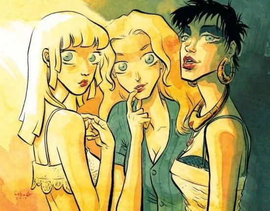 Fábio: Como o Bá ainda ia passar o ano inteiro desenhando “Dois Irmãos”, e como eu e o Bá temos essa opinião (não sei se correta, mas ainda assim) de que eu desenho melhor mulheres – e sabendo que na histórias teríamos várias mulheres para desenhar –, já de cara decidimos que eu faria o desenho da história. Fizemos o roteiro juntos, da maneira que aprimoramos no Dois Irmãos, com rascunhos das páginas sendo feitos ao mesmo tempo em que o texto final era escrito, então o roteiro é uma miniversão da história, um roteiro visual, desenhado. Assim, no roteiro que mostramos para a editora e para o Neil já dava para ver quantos quadrinhos tinha cada página, o enquadramento, o ritmo visual de leitura.