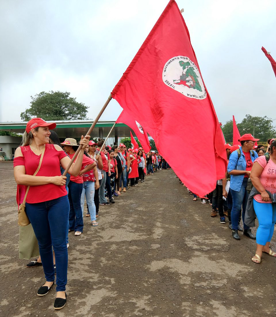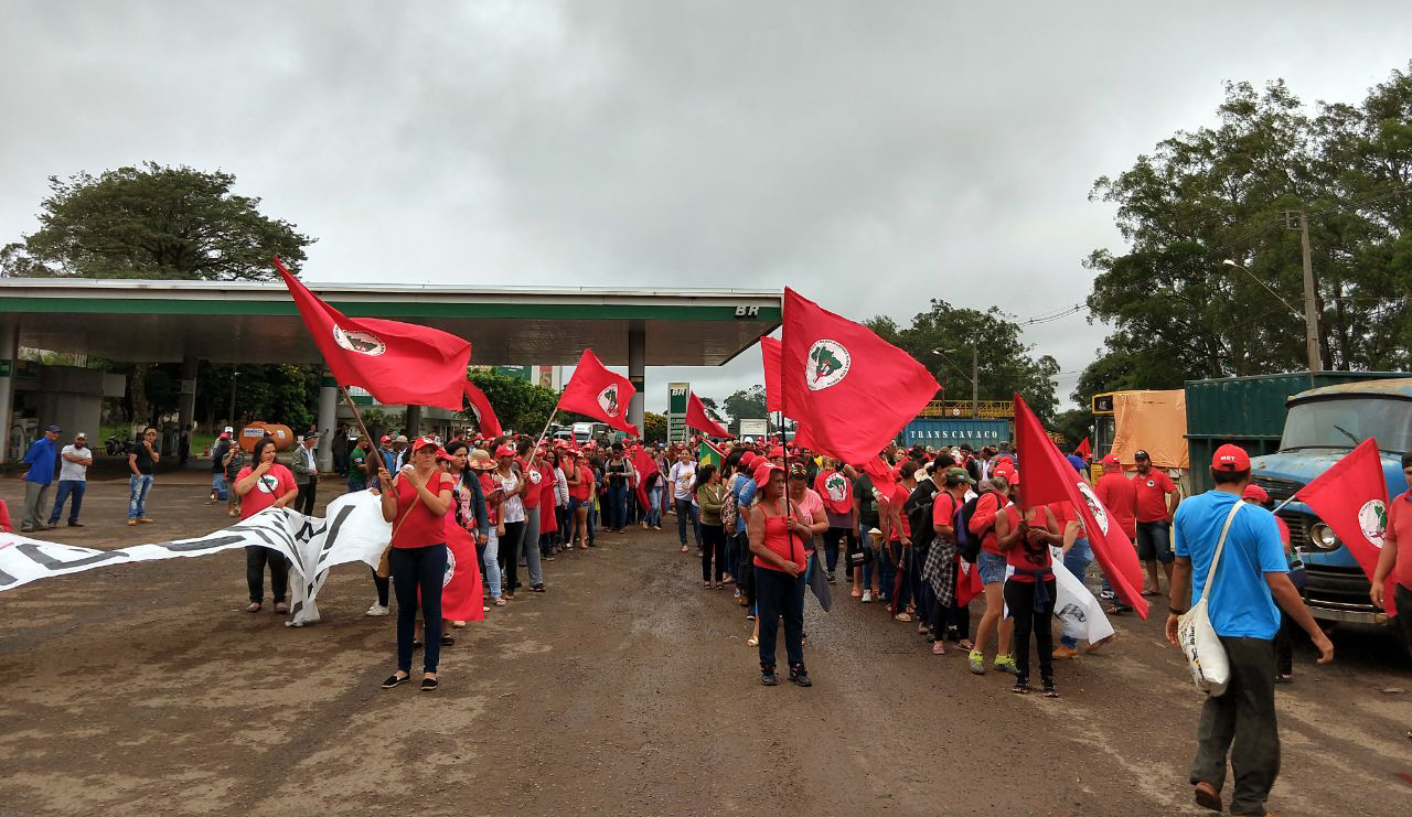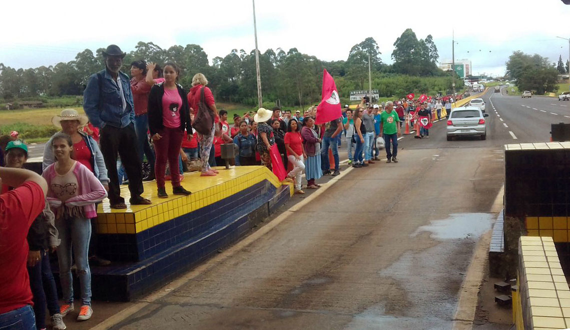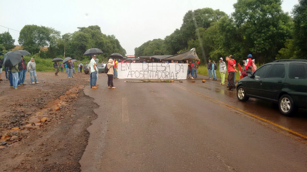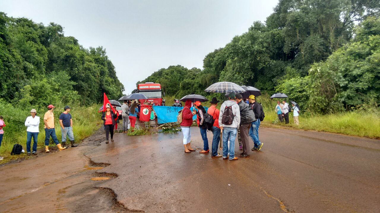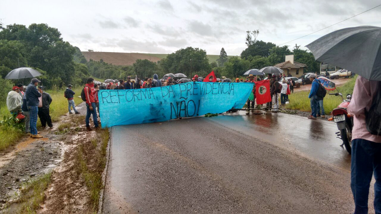 Em Rio Bonito do Iguaçu cerca de 500 Trabalhadores e Trabalhadoras do Movimento Sem Terra (MST) Interditam a BR-158 entre Rio Bonito do Iguaçu e Saudade do Iguaçu em mobilização contra e Reforma da Previdência. Foto: MST/PR