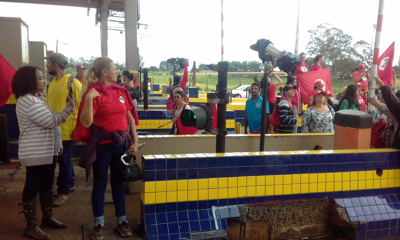 Em Arapongas, no norte do Paraná, integrantes do MST ocuparam a praça de pedágio da região e liberam as cancelas para os veículos passarem sem pagar a tarifa. Ato faz parte das atividades do Dia Nacional de Luta contra a Reforma da Previdência. Foto: MST/PR