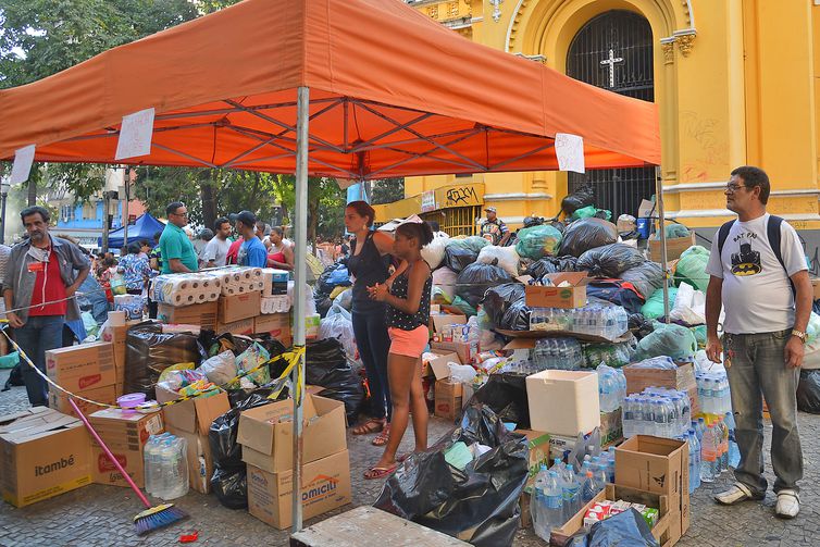 Desabrigados do edifício Wilton Paes de Almeida, que desabou após incêndio na última terça-feira (1º), recebem doações em frente a Igreja Nossa Senhora do Rosário dos Homens Pretos, no Largo do Paissandu. Foto: Rovena Rosa/Agência Brasil