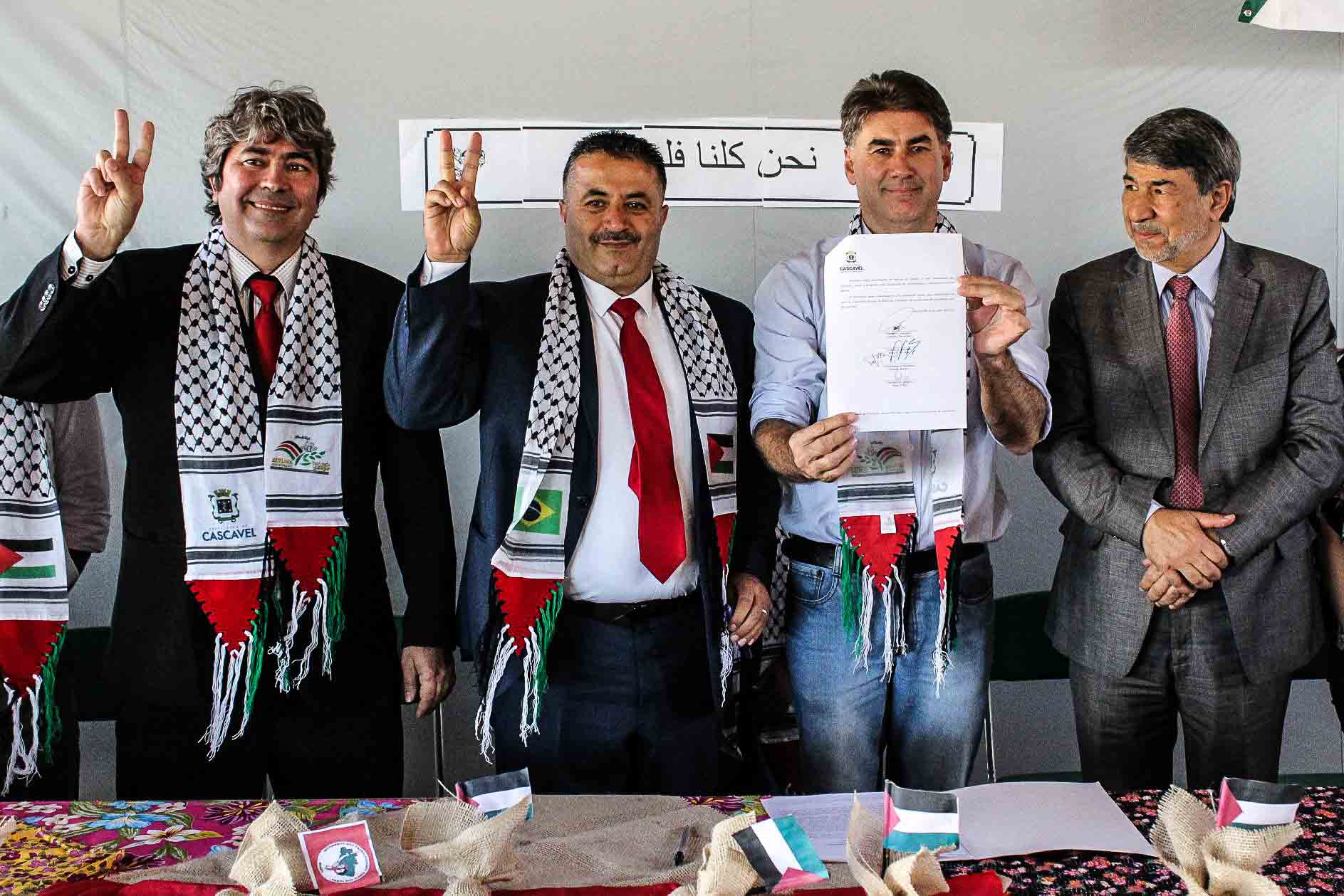 O embaixador da Palestina no Brasil, Ibrahin Alzeben, e uma delegação da cidade palestina de Beitunia, que fica no centro da Cisjordândia, assinaram, na última sexta-feira (22), um acordo de cooperação e irmandade com a cidade de Cascavel, no Oeste do Paraná. O ato de celebração aconteceu na Escola Zumbi dos Palmares, recém-inaugurada após funcionar por anos como uma escola itinerante do Movimento dos Trabalhadores Rurais Sem Terra (MST) no Assentamento Valmir Mota.