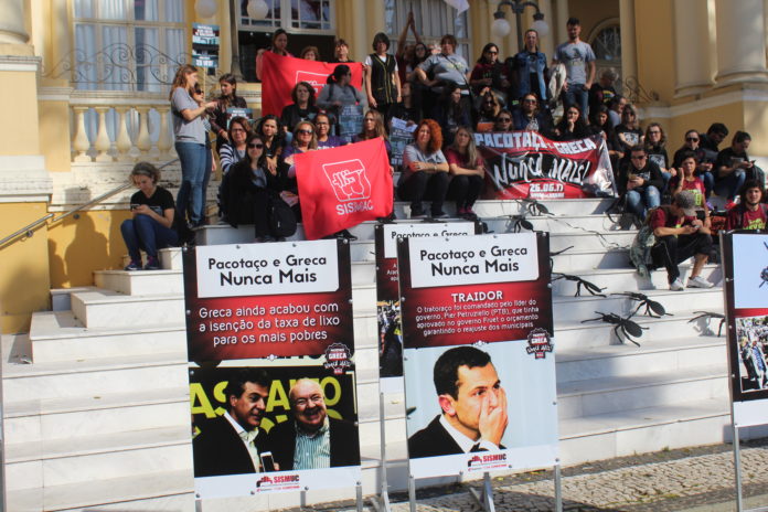 Os servidores municipais de Curitiba protestam em três pontos da cidade no aniversário do Pacote de Maldades. O projeto foi aprovado em 26 de junho de 2017, congelando salários, carreiras e alterando alíquotas do IPMC e ICS. O “plano de recuperação” ainda transferiu a data-base dos servidores para outubro e aumentou impostos para a população como IPTU, ITBI e ISS.