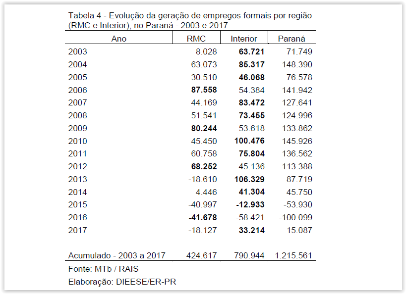 A Região Metropolitana de Curitiba apresentou uma perda de postos de trabalho na comparação do ano de 2017 para 2016, com a redução de 18.127 empregos. Por outro lado, o interior do Estado apresentou uma geração de 33.214 empregos, desta forma o Paraná teve um saldo de 15.087. De 2003 até 2017, o interior “venceu” dez a RMC na geração de empregos. Apenas três vezes a região metropolitana gerou mais empregos.