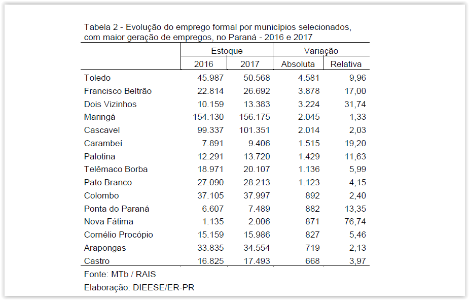 Cascavel (2.014), Carambeí (1.515) foram os municípios que mais geraram novos postos de trabalho. O aquecimento se deu na “Indústria de alimentos e bebidas, em especial a atividade de abate de aves nas regiões oeste e sudoeste e no município de Carambeí”, segundo o estudo.