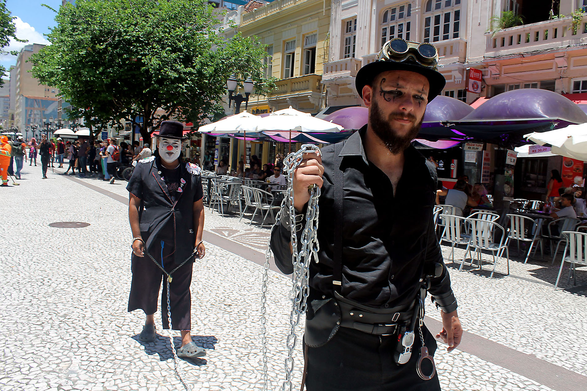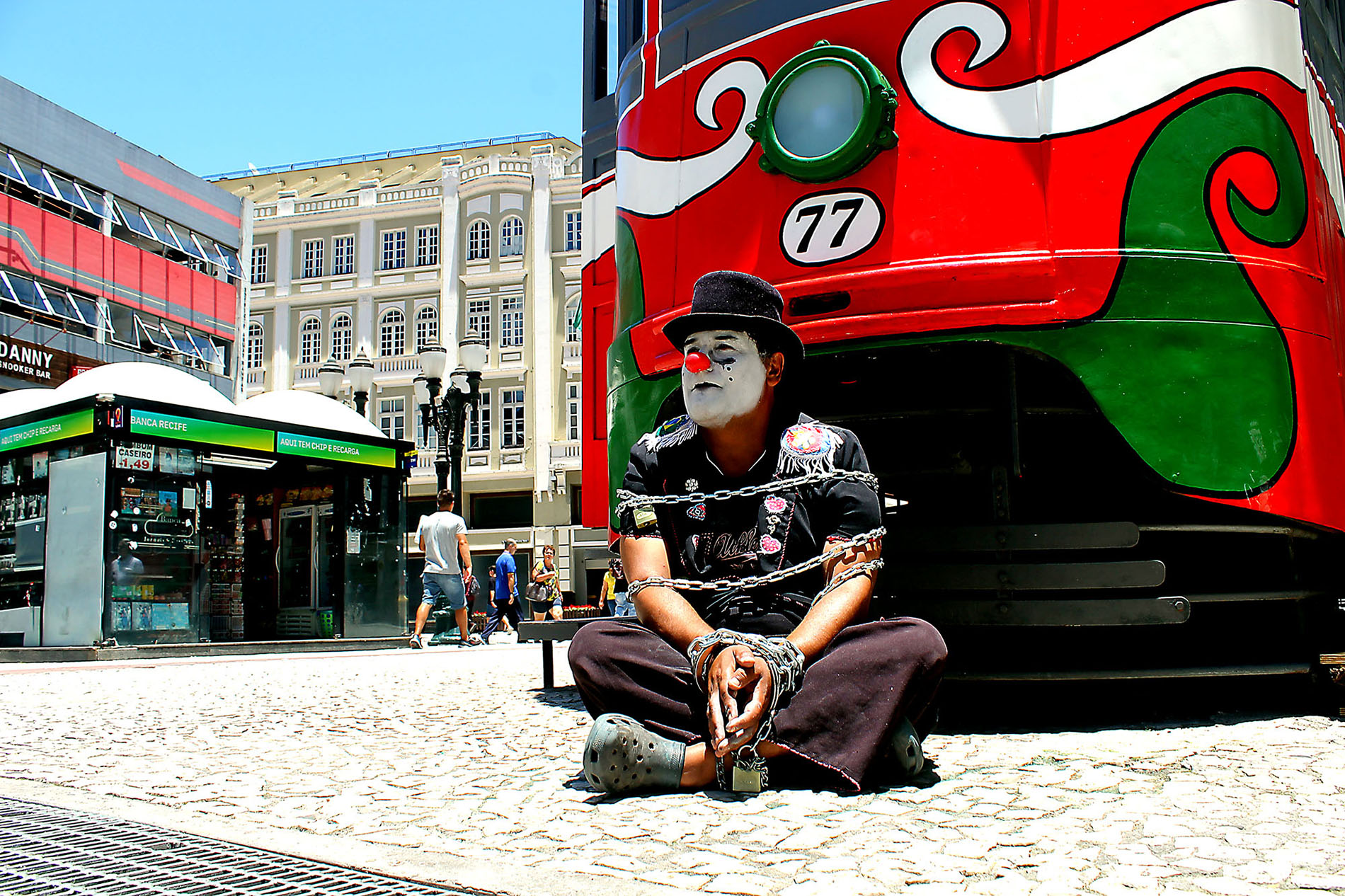 O artista Carlos Alberto Gomes, o ‘Palhaço Chameguinho’, que trabalha há mais de 30 anos nas ruas, decidiu se acorrentar para chamar a atenção do poder público. É a segunda vez que o artista protesta desta forma contra a proibição de seu trabalho. “Em 1997 o mesmo prefeito [Rafael Greca] proibiu a arte de rua. Naquela época me acorrentei na XV e fiquei dois meses e quinze dias acorrentado. Dessa vez farei de novo. É triste chegar em casa e falar para minha filhas que o pai vai ficar fora alguns dias para lutar pelo seu direito e para lutar pelo direito de todos os artistas de rua”, afirmou o palhaço.