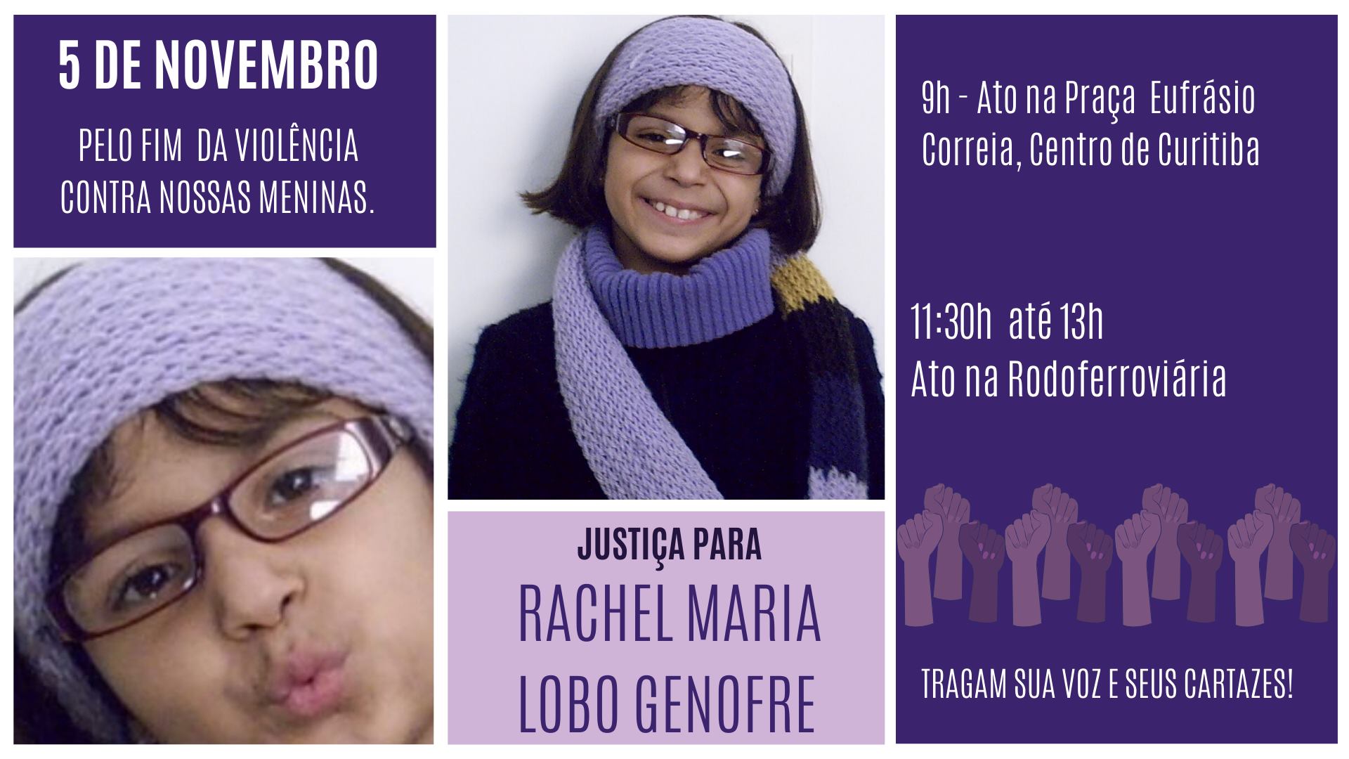 Nesta terça-feira, 5 de novembro, a Frente Feminista de Curitiba e Região Metropolitana promoverá atos para lembrar do assassinato da menina Rachel Maria Lobo Genofre e cobrar justiça de tantas outras mulheres que permanecem sem solução. Após 11 anos, a polícia identificou o autor do crime; o réu confesso Carlos Eduardo dos Santos, de 54 anos, que estava preso em Sorocaba (SP) e teve seu DNA comparado com o da cena do crime.