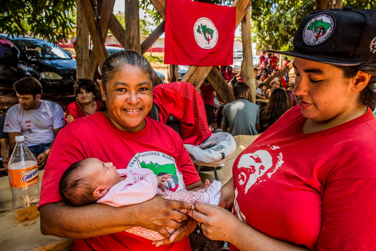 “Quando a gente chegou aqui era tudo cana, não tinha um passarinho, não tinha vida”, relembra Claudia Feltrin, integrante da coordenação do acampamento e da direção estadual do MST, que participa do acampamento desde o início da organização. Emocionada, a agricultora relata o esforço coletivo e continuado para criar uma verdadeira cidade com as 250 famílias moradoras, onde antes só havia cana e trabalho degradante e desumano.