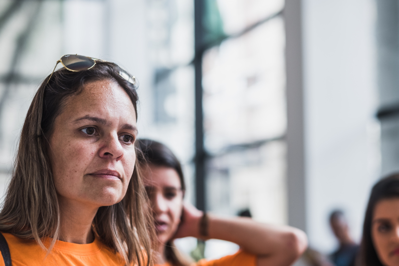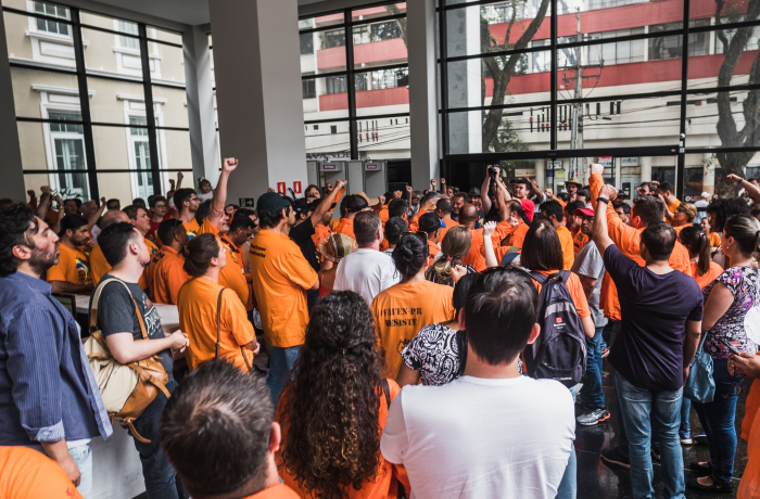 Ao entrar no prédio sede do Tribunal Regional do Trabalho em Curitiba, no início da tarde desta terça-feira, 18 de fevereiro, a primeira imagem que se destaca entre coletes alaranjados é a de cinco crianças sentadas num sofá. Ao redor delas, mulheres com camisetas, também de cor laranja, com escritos de Fafen Resiste.