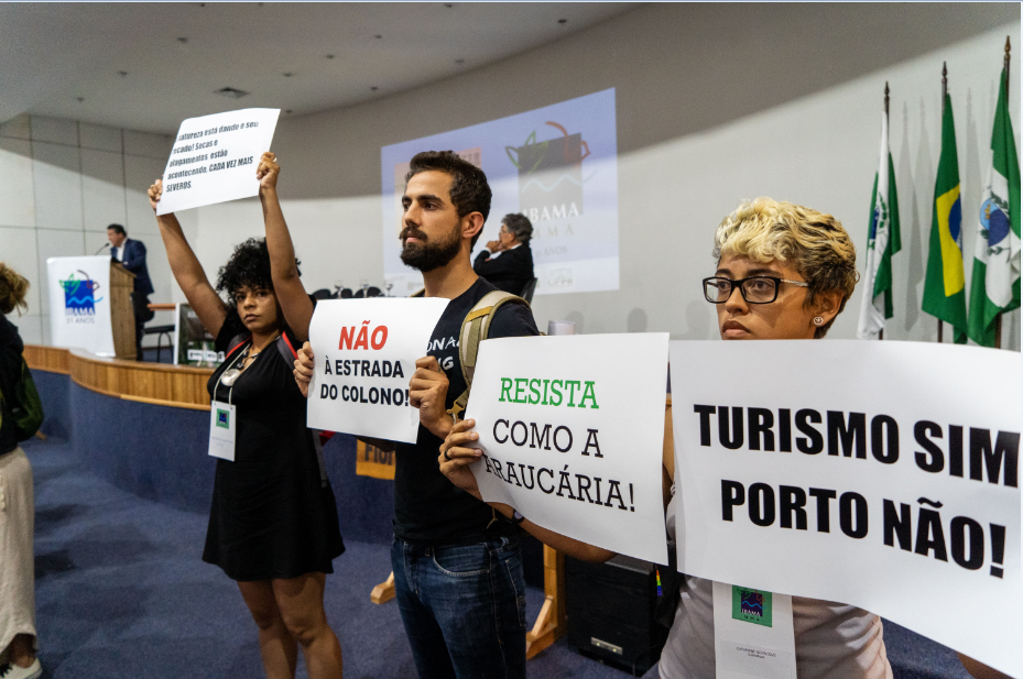 Daniela Borges, Verônica Rodrigues e Raíssa Fayet: O objetivo da nossa manifestação no evento de aniversário de 31 anos do IBAMA foi enfatizar que a sociedade civil não está de acordo com essa agenda destrutivista e com esse desmonte ambiental, social e político que vem acontecendo em nosso estado e país. Os integrantes da mesa tornaram um evento que deveria ser sério e de extrema importância para a agenda ambiental do Paraná em um palanque político, com piadas desmoralizando ambientalista, cientistas e a própria sociedade civil.