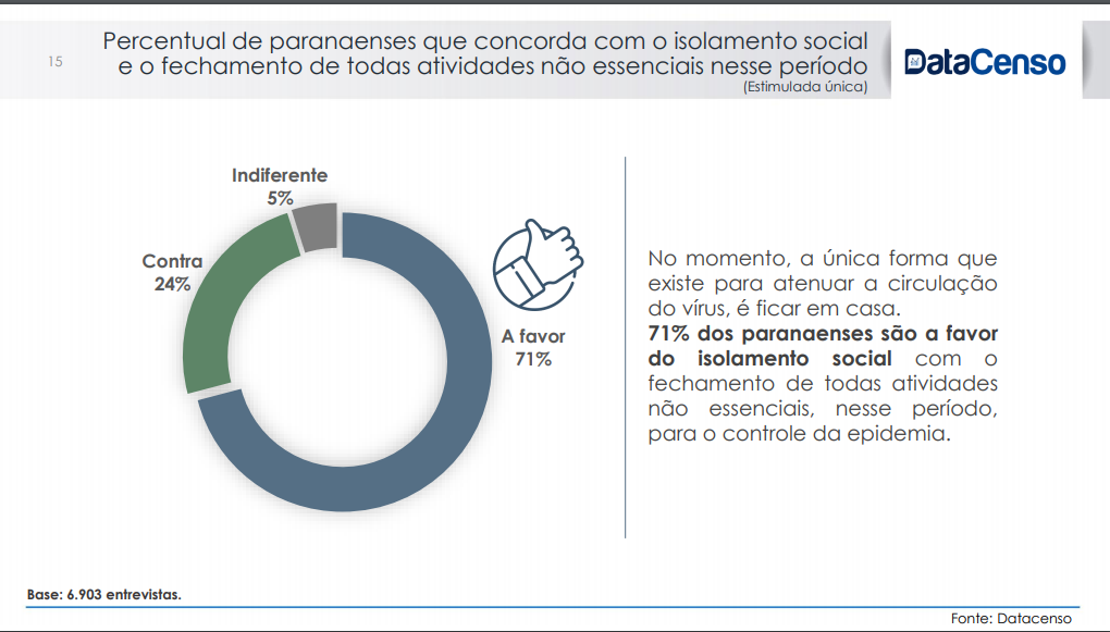 Por fim, a pesquisa Datacenso citada pela ACP “revela que os paranaenses são a favor do isolamento social, ficar em casa é a melhor maneira de prevenir o coronavírus, e concordam com o fechamento de todas as atividades “não essenciais”, escolas e faculdades, para o controle da epidemia”.