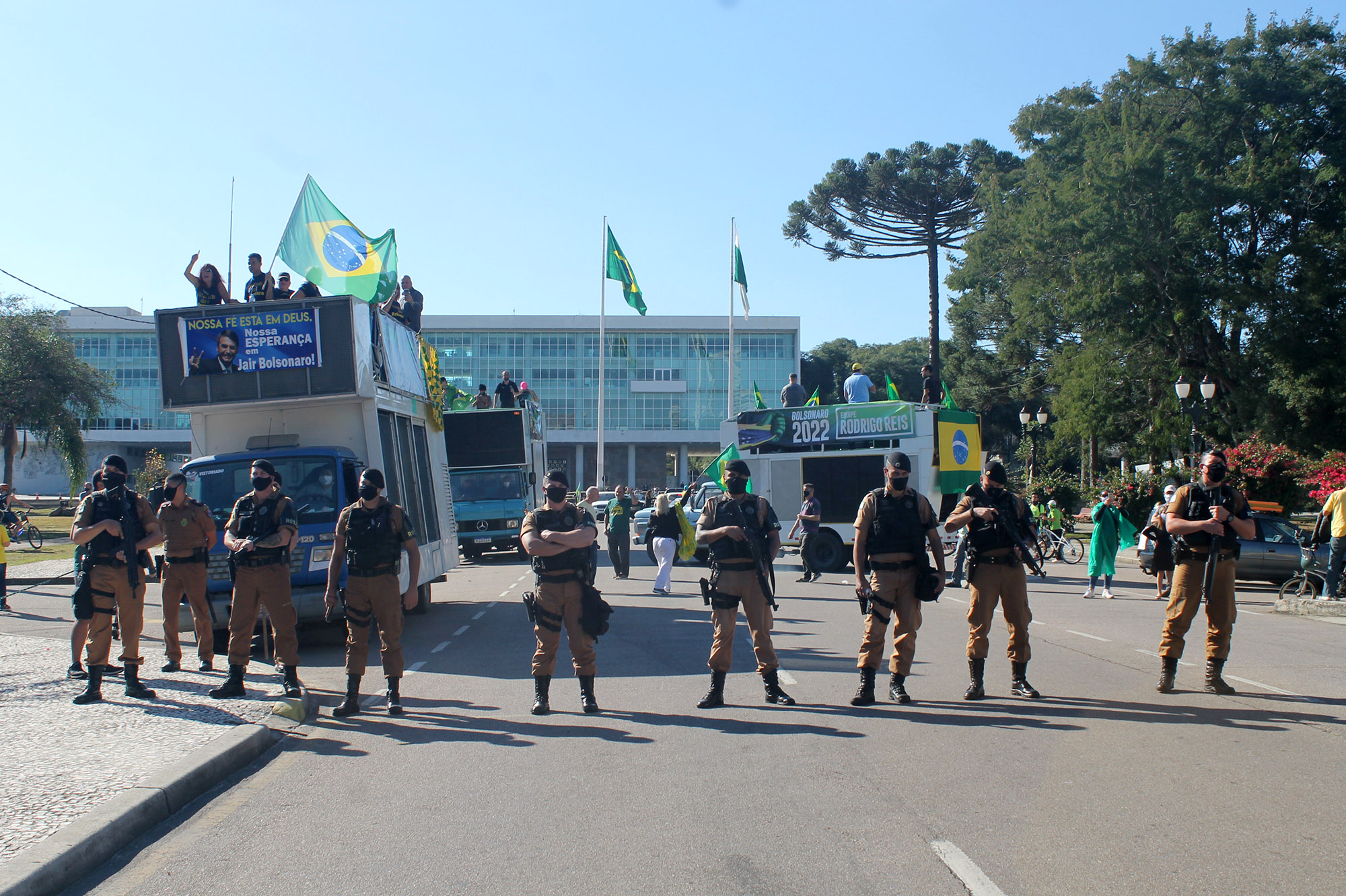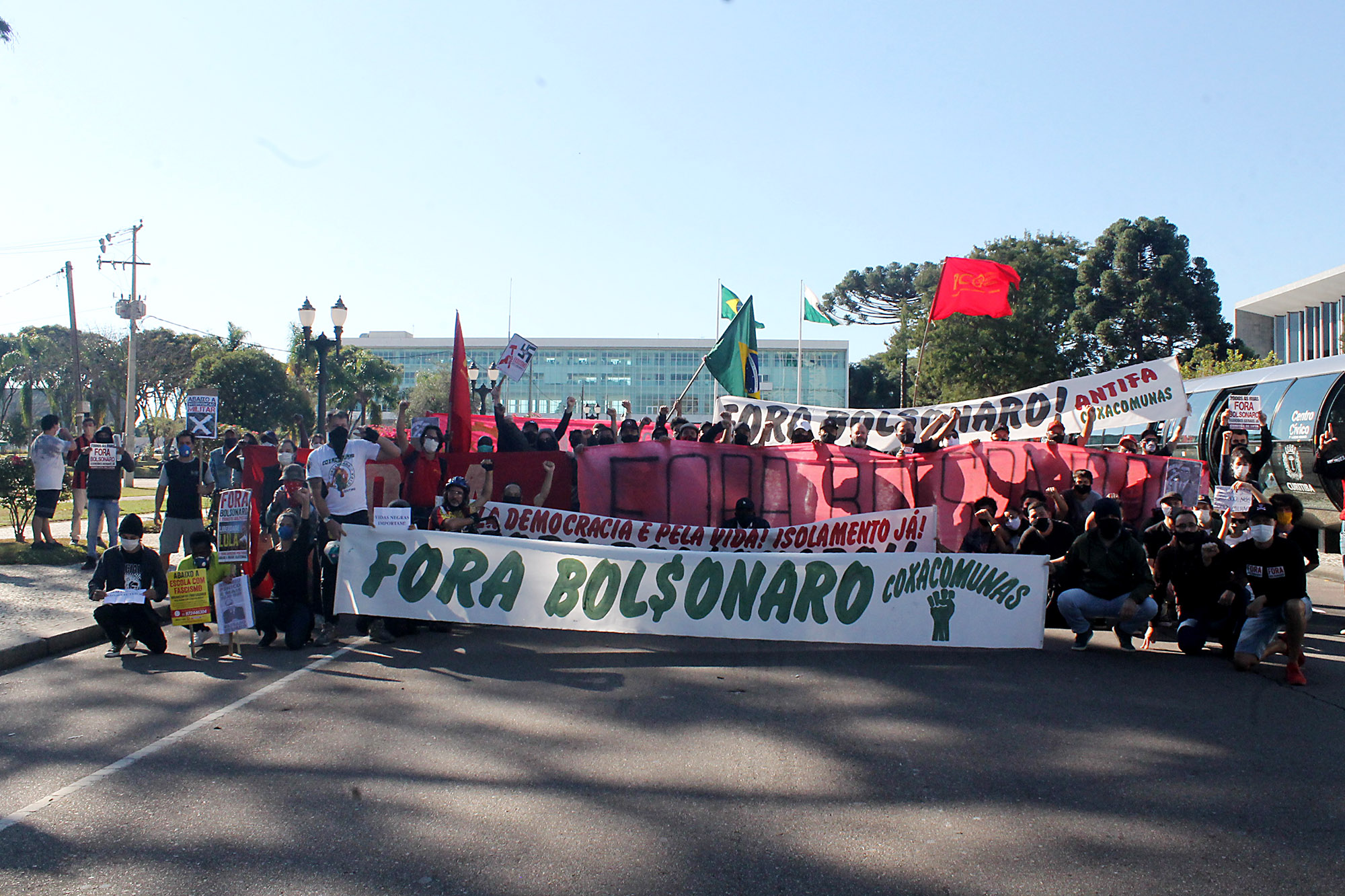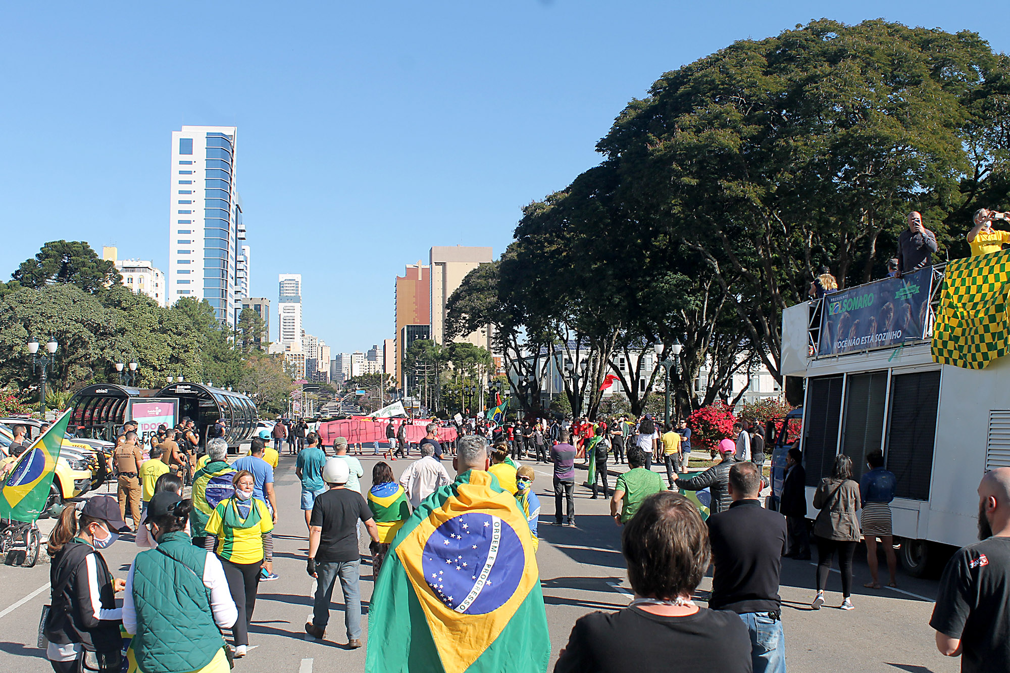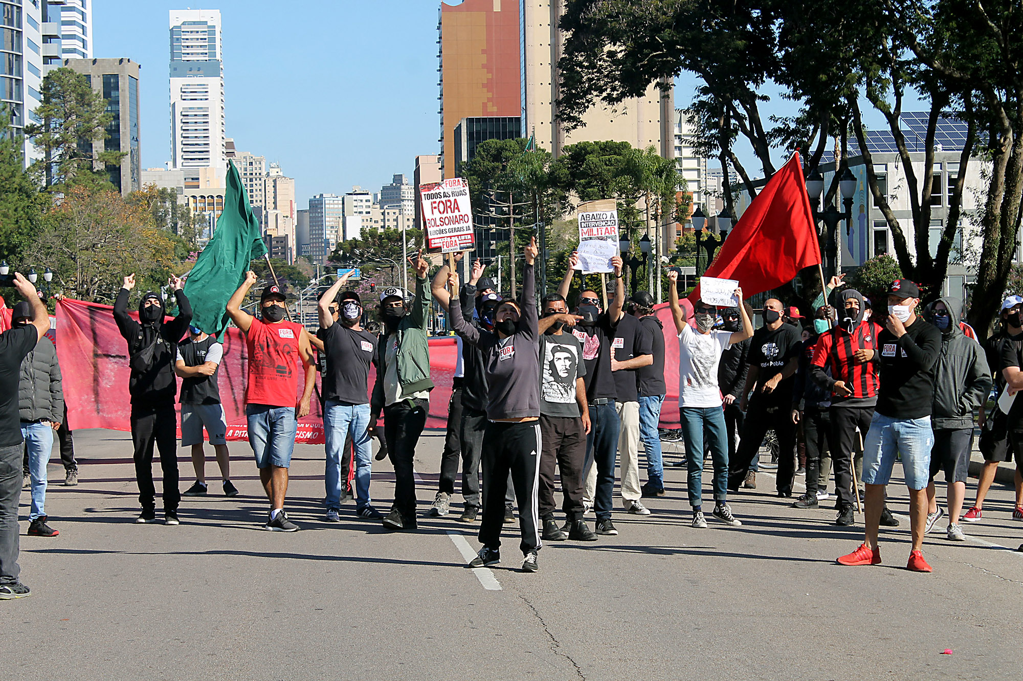 Cerca de 100 manifestantes, na maioria integrantes de coletivos antifascistas de torcedores do Atlético, Coritiba e Paraná Clube, além de militantes do Partido da Causa Operária (PCO), bloquearam no início da tarde a Avenida Cândido de Abreu, no Centro Cívico, local onde iniciaria uma carreata convocada por bolsonaristas. A Polícia Militar foi acionada e fez um cordão de isolamento separando os dois grupos.