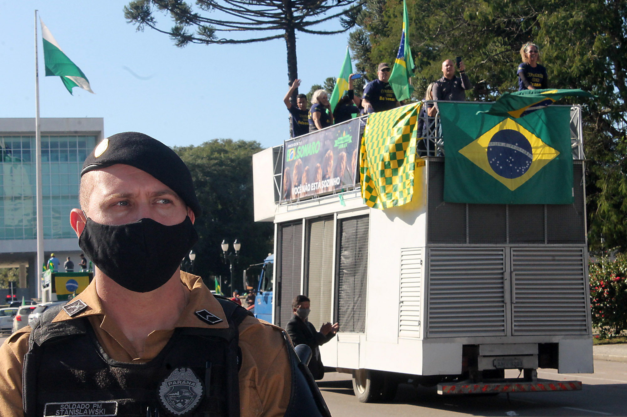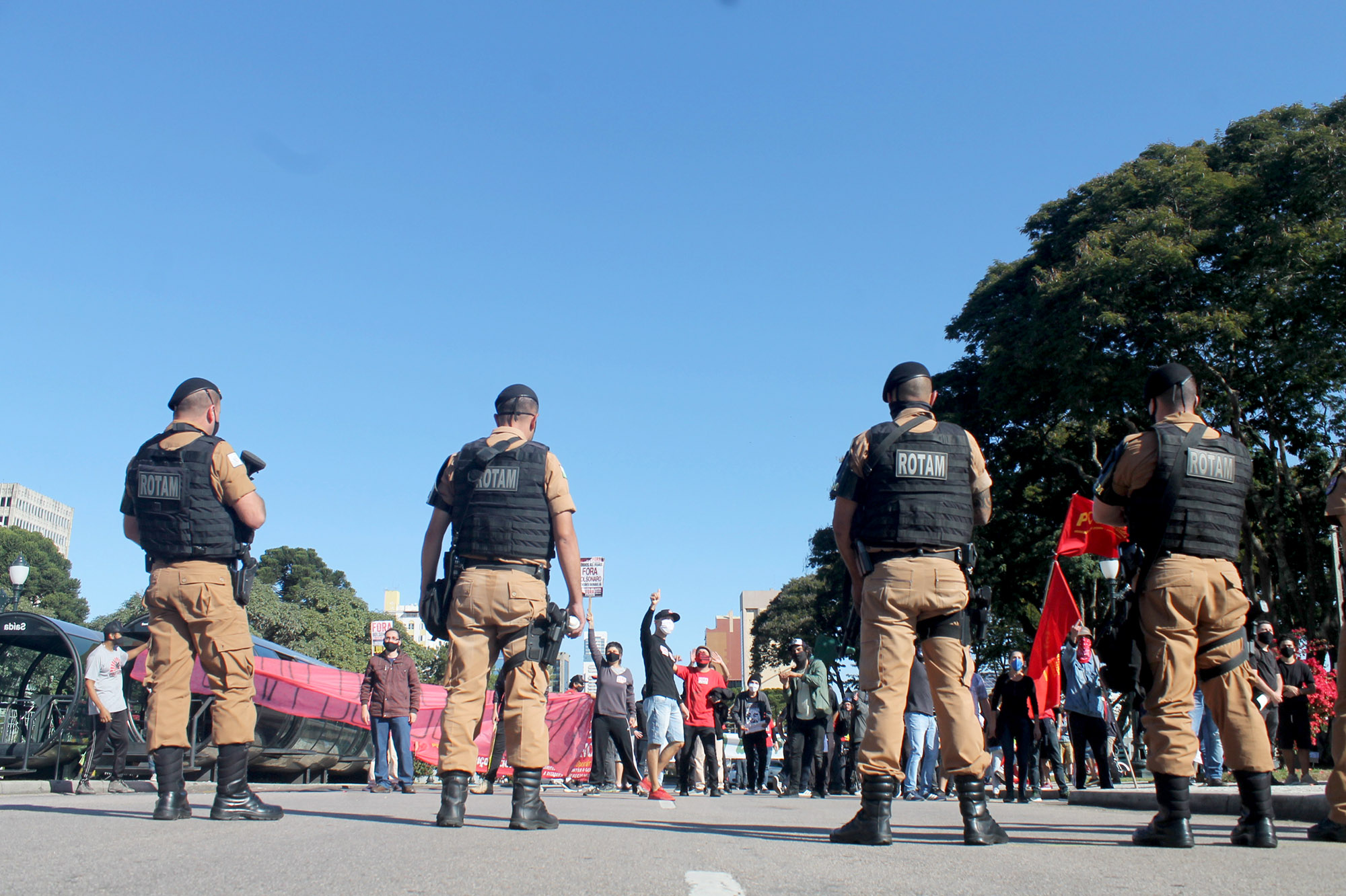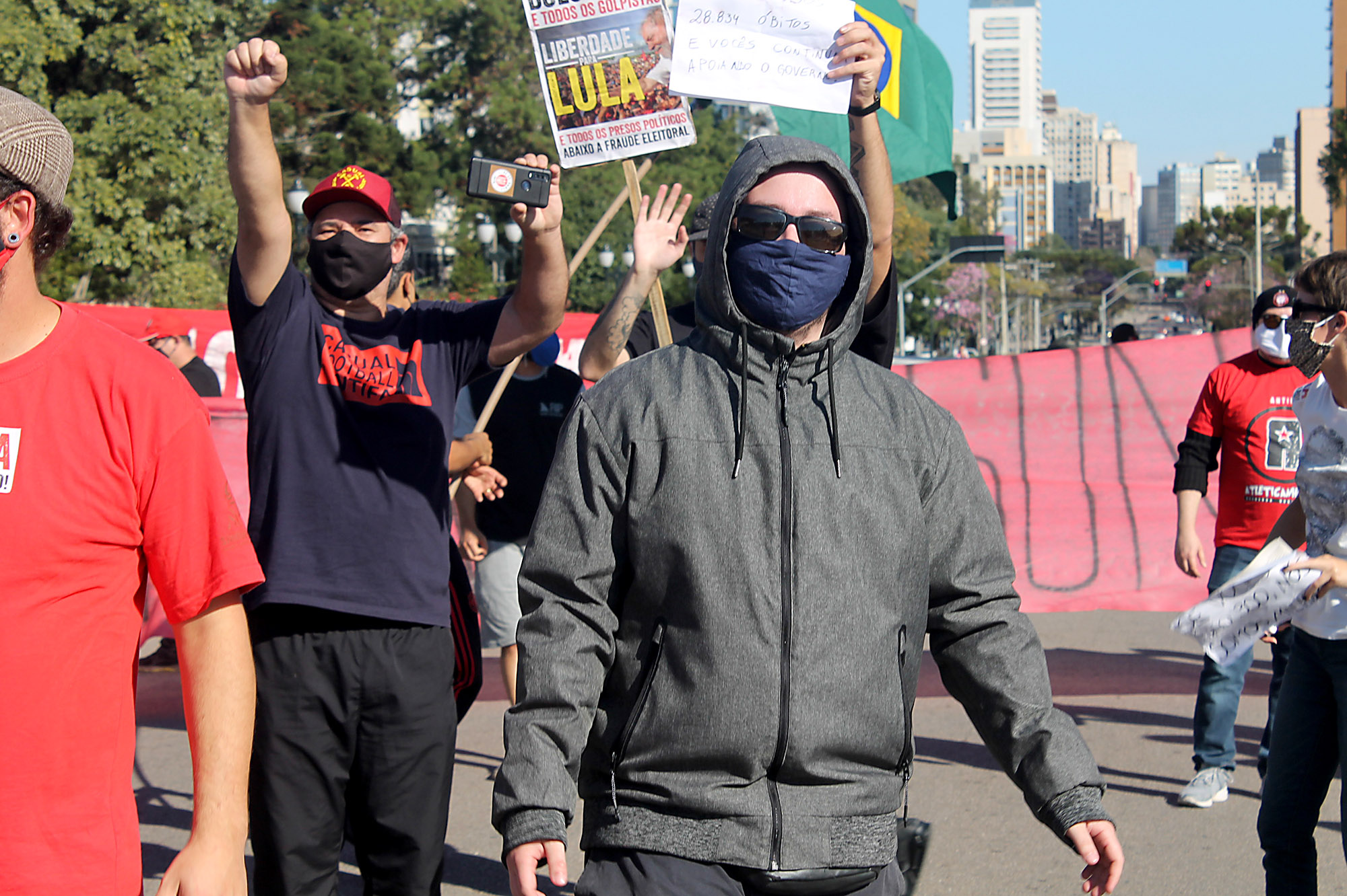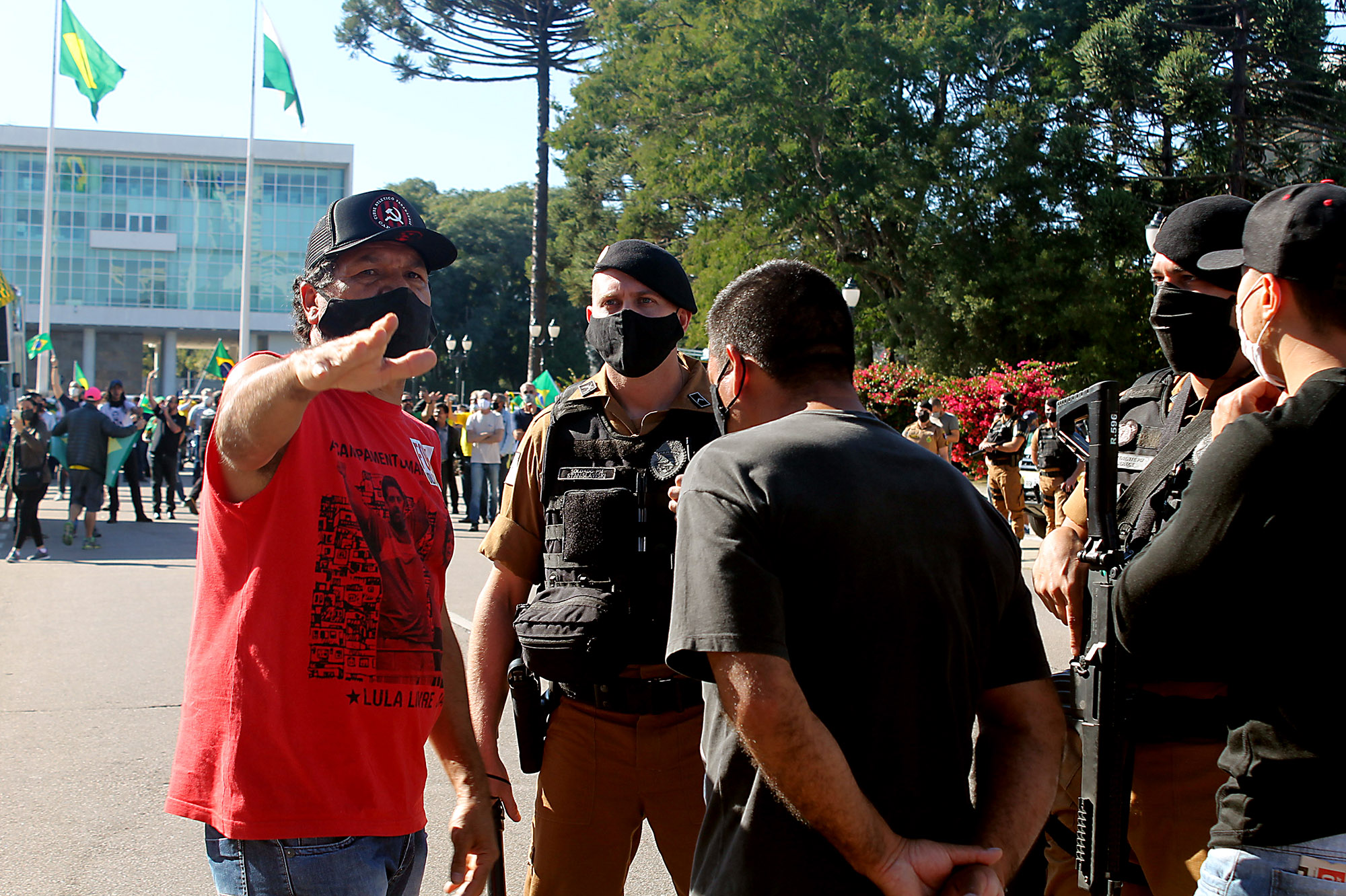 Cerca de 100 manifestantes, na maioria integrantes de coletivos antifascistas de torcedores do Atlético, Coritiba e Paraná Clube, além de militantes do Partido da Causa Operária (PCO), bloquearam no início da tarde a Avenida Cândido de Abreu, no Centro Cívico, local onde iniciaria uma carreata convocada por bolsonaristas. A Polícia Militar foi acionada e fez um cordão de isolamento separando os dois grupos.