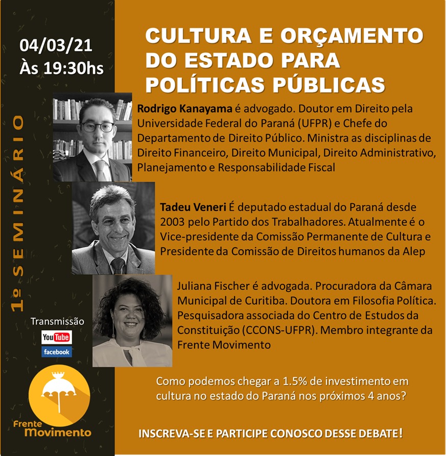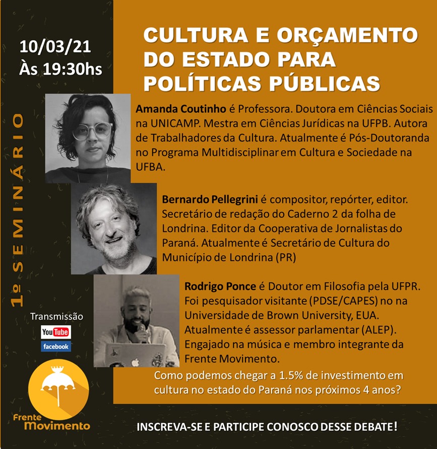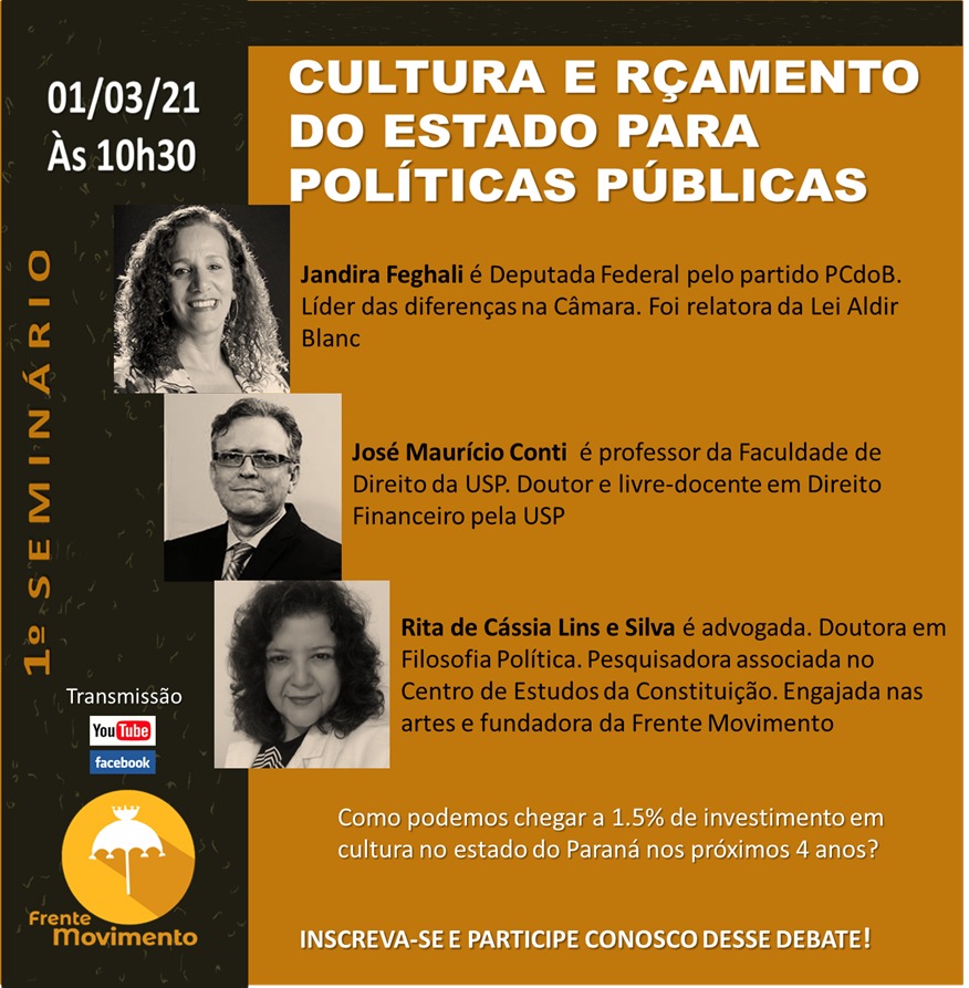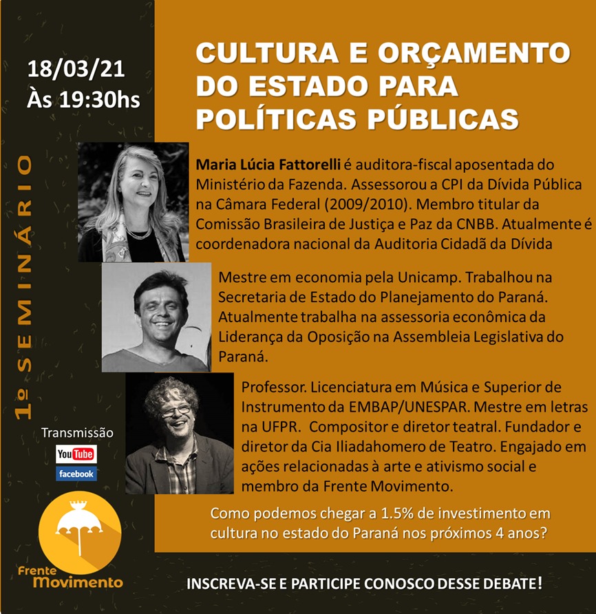 A luta política do setor cultural e a questão orçamentária é o tema do primeiro debate do Seminário Cultura e Orçamento do Estado para Políticas Públicas, que acontece nesta segunda-feira (1), a partir das 10h30, de forma on-line nas redes sociais e é promovido pela Frente Movimento, que tem programado outros 3 debates nos dias 4, 11 e 18 de março.