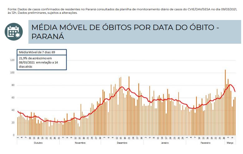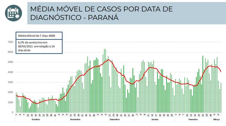 Fatores que levaram o Ministério Público do Paraná a entrar com ação judicial para que o estado mantenha e amplie medidas restritivas. “Na ação, é requerido ainda que o Governo do Estado prorrogue, para além da próxima quarta-feira, 10 de março, a vigência do Decreto Estadual 6.983/21, que impõe medidas mais restritivas para o combate à pandemia. O Ministério Público e as Defensorias entendem que a medida deve durar até que haja comprovação epidemiológica de que o número de casos diagnosticados encontra-se em redução e seja demonstrado que a taxa de ocupação de leitos de UTI no Paraná encontra-se abaixo dos 80%”, defende o MP.